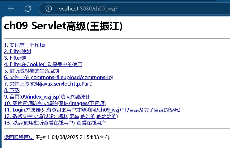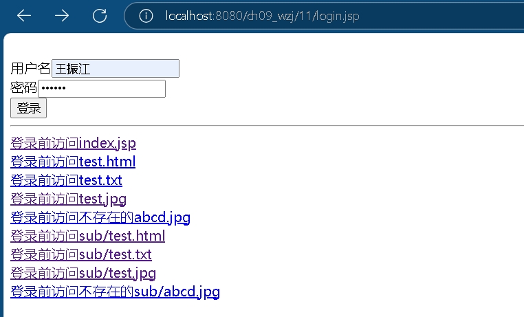 <a href="11/index.jsp">11. Login过滤器(只有登录的用户才能访问/ch09_wzj/11/目录及其子目录的资源)</a><br>